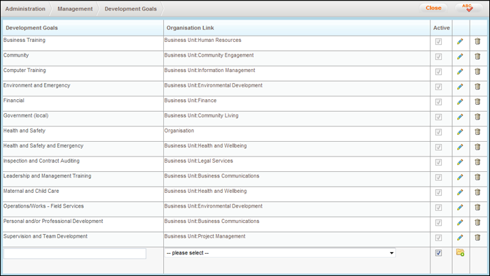 This page displays a list of the Development Goals of the organisation and allows PES Administrator to create, modify and remove categories as required.