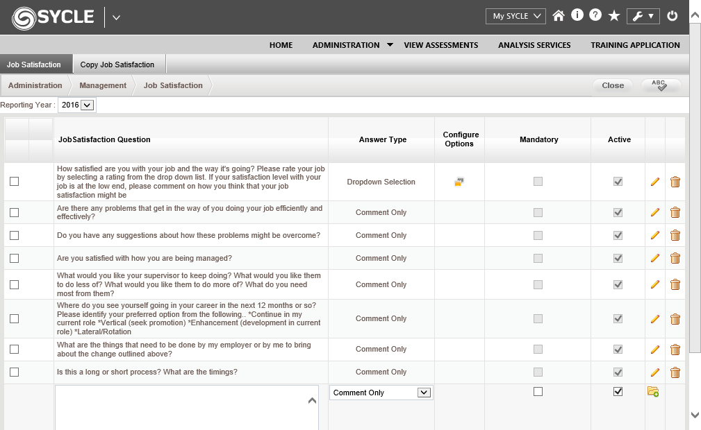 When ticked, indicates that the question is active and is shown in the Job Satisfaction element within the assessment. If unticked, the question will be hidden. |