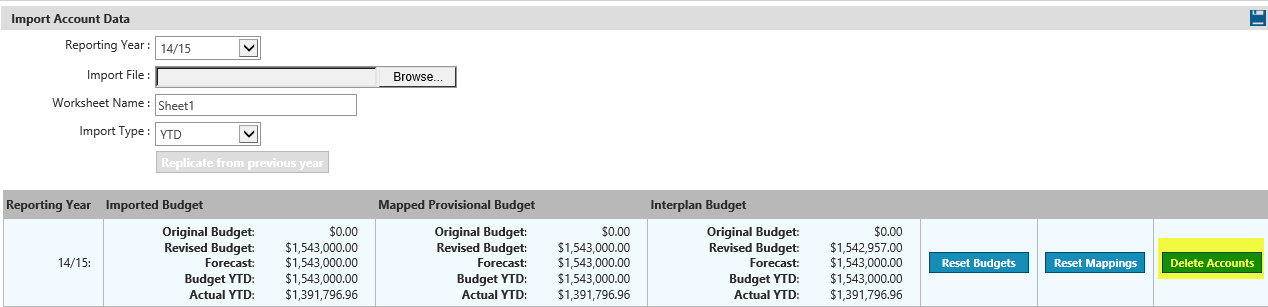 Important: Using this button will delete all imported accounts and mappings for the selected year so please activate and use with caution.