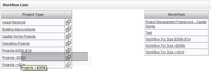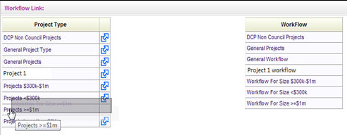 STEP 2: To create a linkage, click on a Workflow from the right hand side and drag it onto a 'Project Type' on the left as illustrated below.