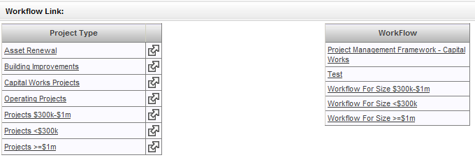 This area lets you link existing workflows to project types. Remember that when creating a new project, its internal structure or 'workflow' is applied based on the 'Project Type' selection within the Project Details object.