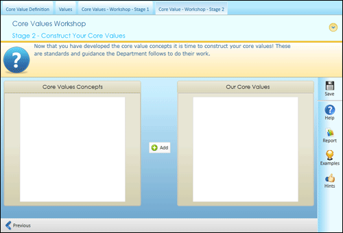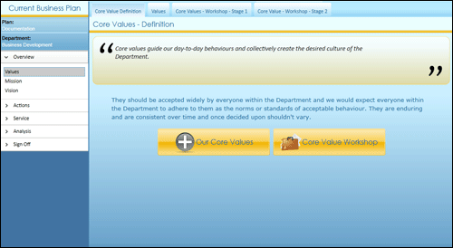The Core Value Definition tab screen describes the importance of core values to the organisation or the department.