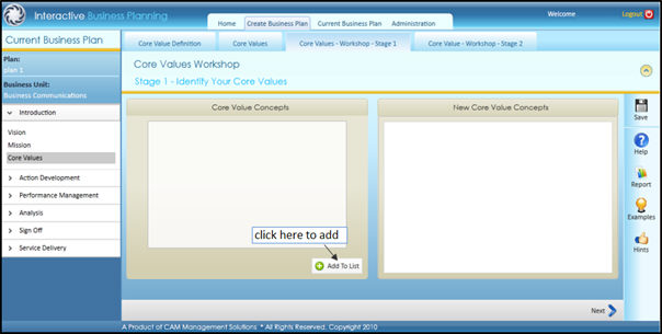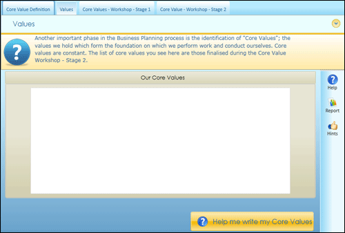 This section allows to define the core values of a business plan. The Core Values page contains a help feature similar to Mission and Vision sections.