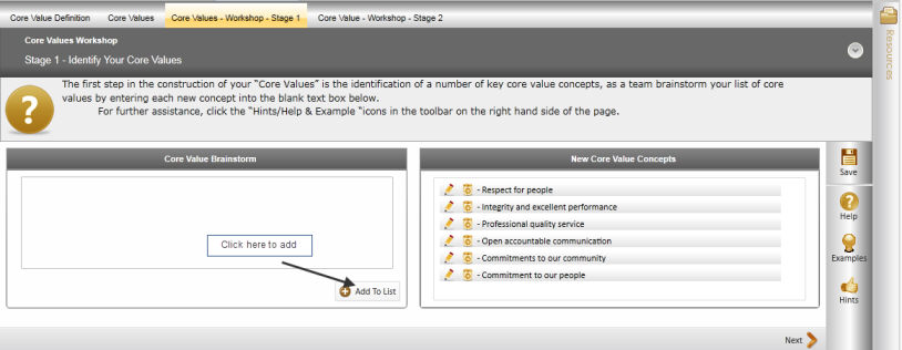 STEP 4: Specify the core value in the text box area and click 'Add to List' button to include it in the 'New Core Value Concepts' pane.