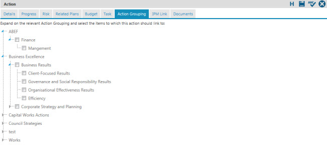 STEP 2: You can expand the action grouping tree which is giving on the left side of the action grouping tab and Select the Action Group that needs to be linked to this action by ticking the check-box. Multiple selections can be made.