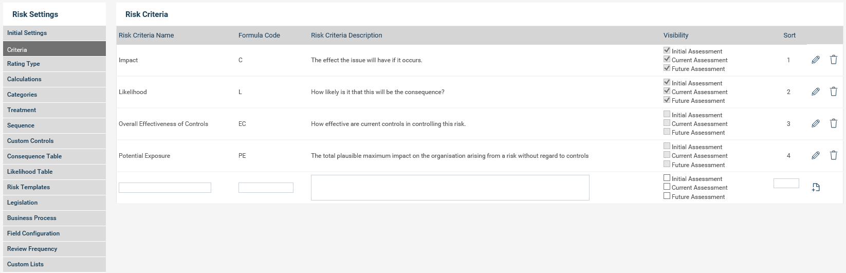 STEP 4: The Sort Field indicates the positioning of the Risk Criteria in the available assessment phases. If two or more fields have the same ‘Sort’ value, they will appear in alphabetical order