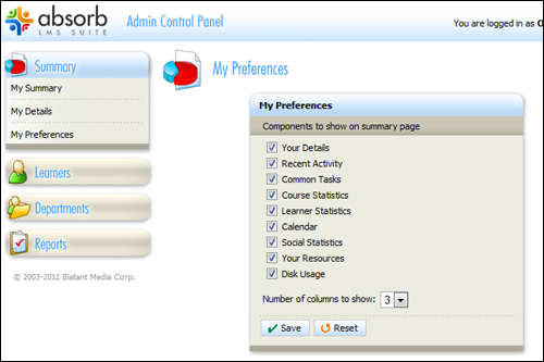 This page enables you to select which information you wish to see on the summary dashboard and rearrange the column layout i.e. 2 columns, 3 columns etc.
