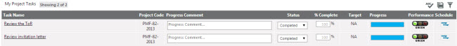 This section provides you with a quick update on Project Tasks assigned to you. This panel would be a very useful method of checking on your current tasks specific to a Project and also being able to update the progress of your project tasks in an instant.
