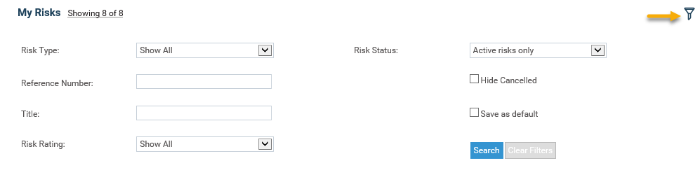 The following filters are available to search and filter your risks: