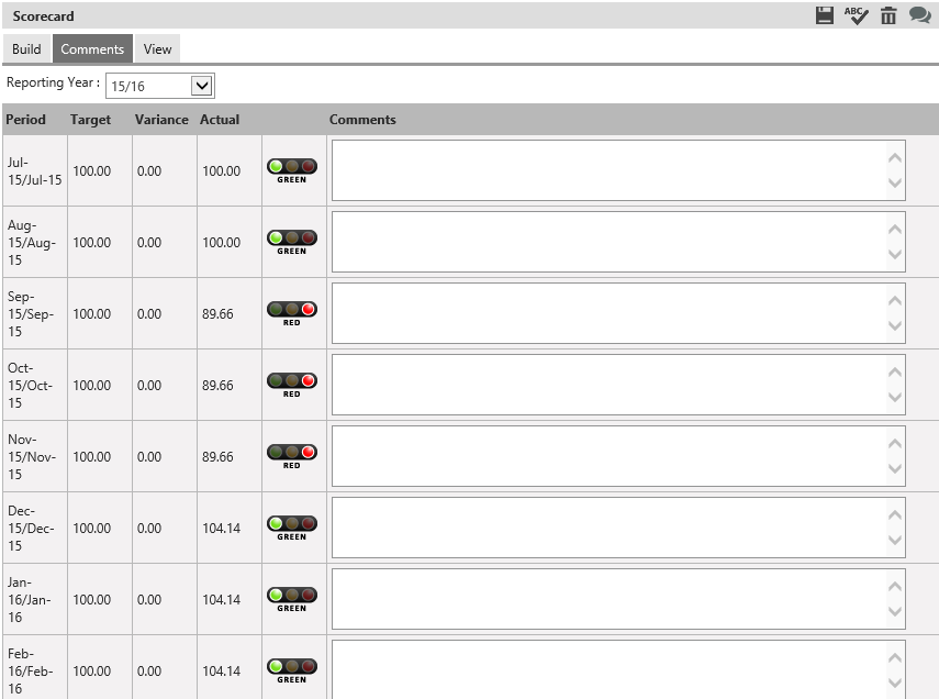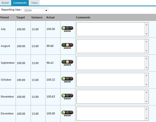 It is possible to enter Scorecard comments per period that may explain performance – particularly if performance was well above or below expectations. The latest comment can appear on executive reports.
