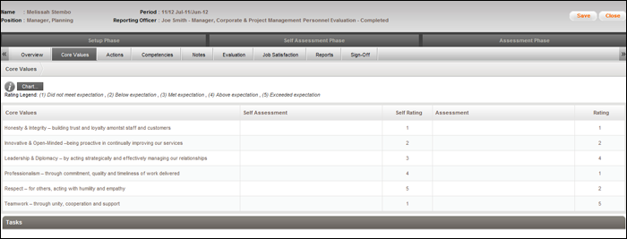 In addition to the provision of Ratings and Assessment comments, the system provides functionality to produce a chart which graphically compares the Ratings obtained from the Assessee and Reporting Officers.