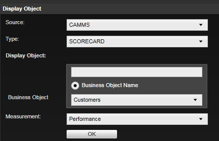 Defines the business objects that are displayed within the widget. Select the scorecard that needs to be displayed from the drop down. Enter the name of the scorecard in the text field above to quickly retrieve it. |