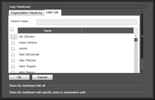 This option lists all users within the system. Choose the users by ticking the checkbox. Type in a name in 'Search Users' text entry field and hit the Enter key on the keyboard to search for users with that particular name.