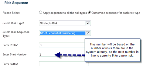 The sequence tab allows the user to configure automatic risk numbering. You may apply the sequence to all risk types or customise them for each risk type.