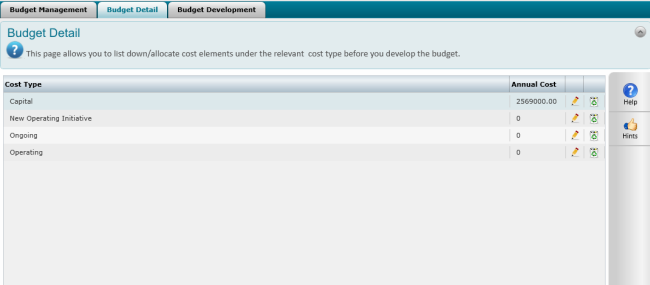 STEP 1: Navigate to budget detail tab within Budget element. Cost types created within the Administration area will be listed here, given that they are allocated under the respective financial year.