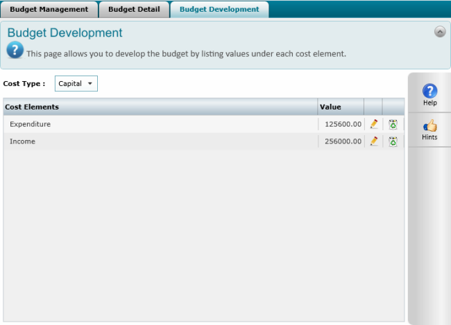 STEP 1: Navigate to 'Budget development' tab within the Budget element. Select the cost type from the dropdown to list all the cost elements within the selected type.