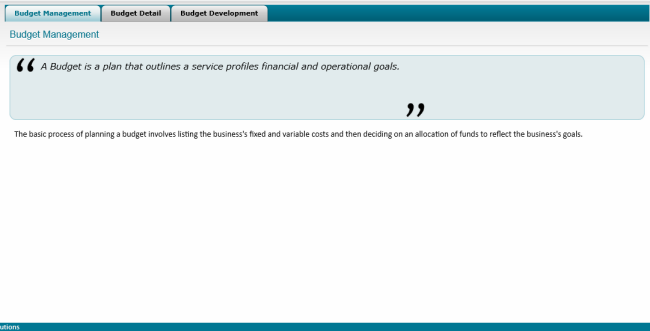 Budget element allows creating the budget plan for the service profile. The Budget management tab provides an overview of budget and the budget process.