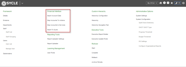 From the SYCLE Header click on the Wrench menu and navigate to Financial Interface section.